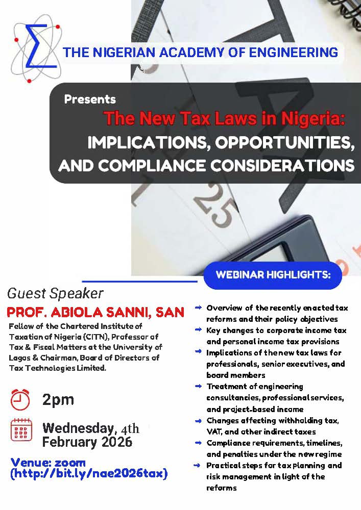 INVITATION TO A WEBINAR“The New Tax Laws in Nigeria: Implications, Opportunities and Compliance Considerations" We are pleased to inform you that the Nigerian Academy of Engineering will host a webinar on... Read more